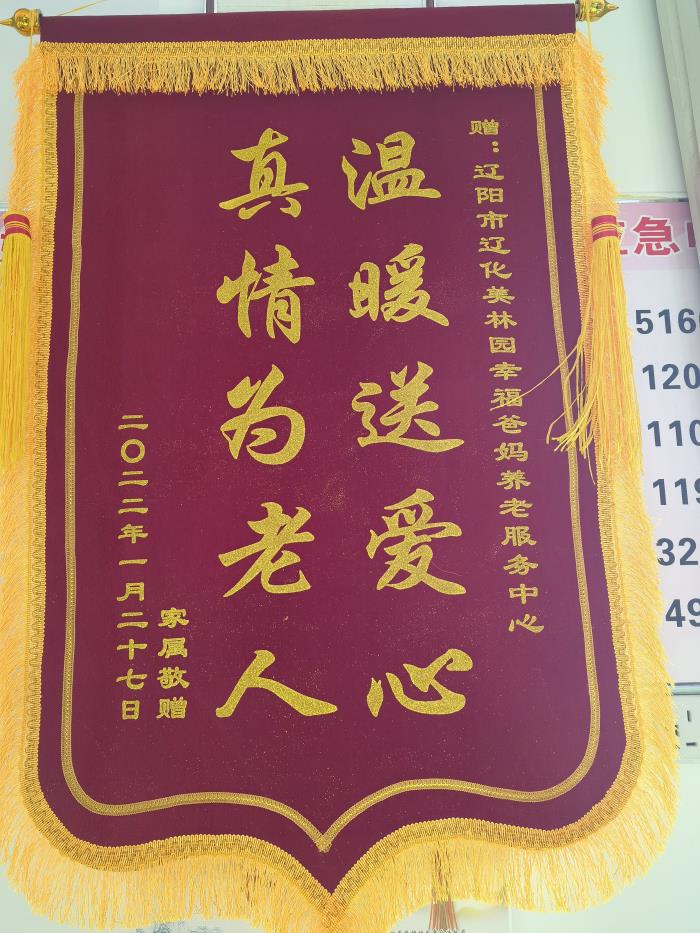 幸福爸妈美林园养老服务站老人王丽女儿从外地给养老院邮寄一面锦旗,感谢幸福爸妈对老人的无微不至的照顾,代替了女儿尽孝,让远方的女儿放心。