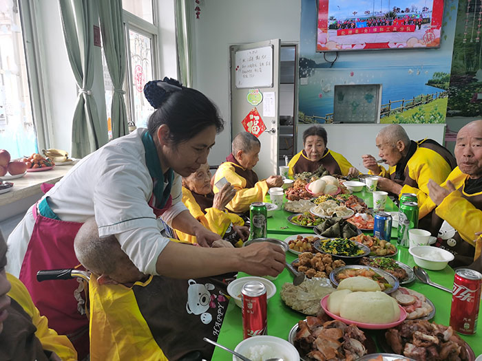 8、幸福爸妈养老服务各个驿站里是统一食谱、统一管理,按照老人的饮食结构特点进行烹调,花样翻新,顿顿不重样,剩饭剩菜不准给老人食用,所有护理员都在为老人进餐忙前忙后,保证老人吃饱、吃好,并有节日的祝福。